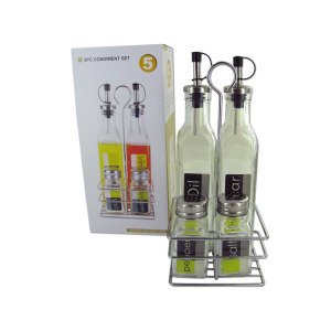This useful set is ideal for any kitchen counter top. Design ensures that this works in any kitchen's decor. Set includes basket with room for each item, a bottle for oil, a bottle for vinegar and shakers for salt and pepper. Each are marked for ease of use.