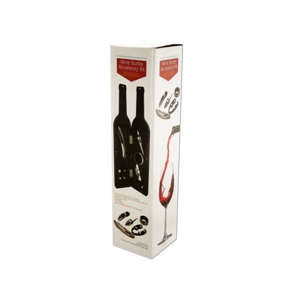 Enjoy your favorite wines to their fullest with this 6-piece Wine Bottle Accessory Kit featuring a variety of tools in a free-standing, magnetic closing, stylish black bottle-shaped display case. Kit includes: combo corkscrew and bottle opener, drip stop ring, stopper, foil cutter and combo pourer and stopper. Case measures approximately 13" tall and 3" in diameter. Comes packaged in an individual box. Box measures approximately 3.25" x 3.25" x 13.25". ,Wine Bottle Accessory Kit in Bottle-Shaped Case,