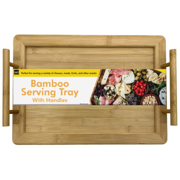 The Bamboo Serving Board Tray with Handles is an attractive and stylish way to serve while entertaining guests. The tray is made of durable bamboo, has a raised edge to keep snacks on the tray, and has two convenient handles to carry and serve. Perfect for serving meals in bed, creating a portable charcuterie board, or serving drinks to guests. This party essential measures approximately 15.5" x .65" x 10.75" with 2" tall handles. Perfect for serving various cheeses, meats, fruits, snacks, desserts, and drinks! Comes packaged loose with a color wrap label.,Bamboo Serving Board Tray with Handles,