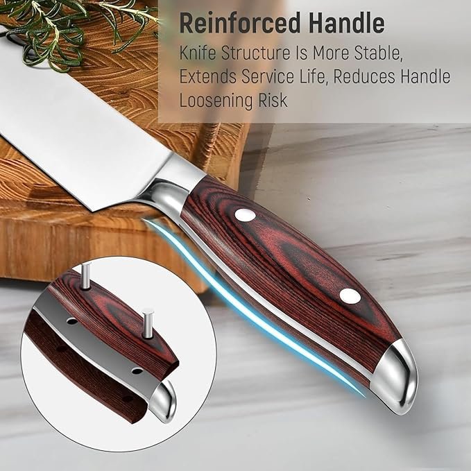 This 5-piece kitchen knife set is crafted from high carbon stainless steel for excellent durability and edge retention. Each knife features an ergonomic handle that provides comfort and control while chopping, slicing, and dicing. Perfect for everyday kitchen use, this set combines functionality and style, making it ideal for home cooks or as a gift for cooking enthusiasts.