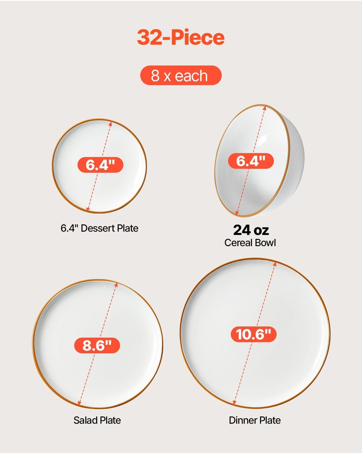 · Essential for 8-Person Families: This 32-piece dinnerware set includes 8 x 6.4 in bowls, 8 x 8.6 in salad plates, 8 x 10.6 in dinner plates, and 8 x 6.4 in dessert plates, ideal for daily meals and gatherings. It also makes nice housewarming gift
