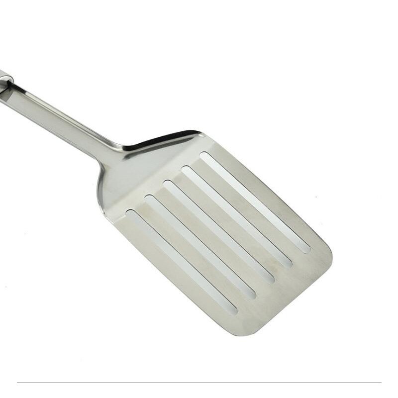 100% restaurant quality stainless steel turner, comfortable ergonomic grips are splinter-free (unlike wooden handles), slotted turner allows grease to drain, and is beveled for easy sliding beneath foods every time! Edged-ended for for functional cutting during grilling, acts as a knife.